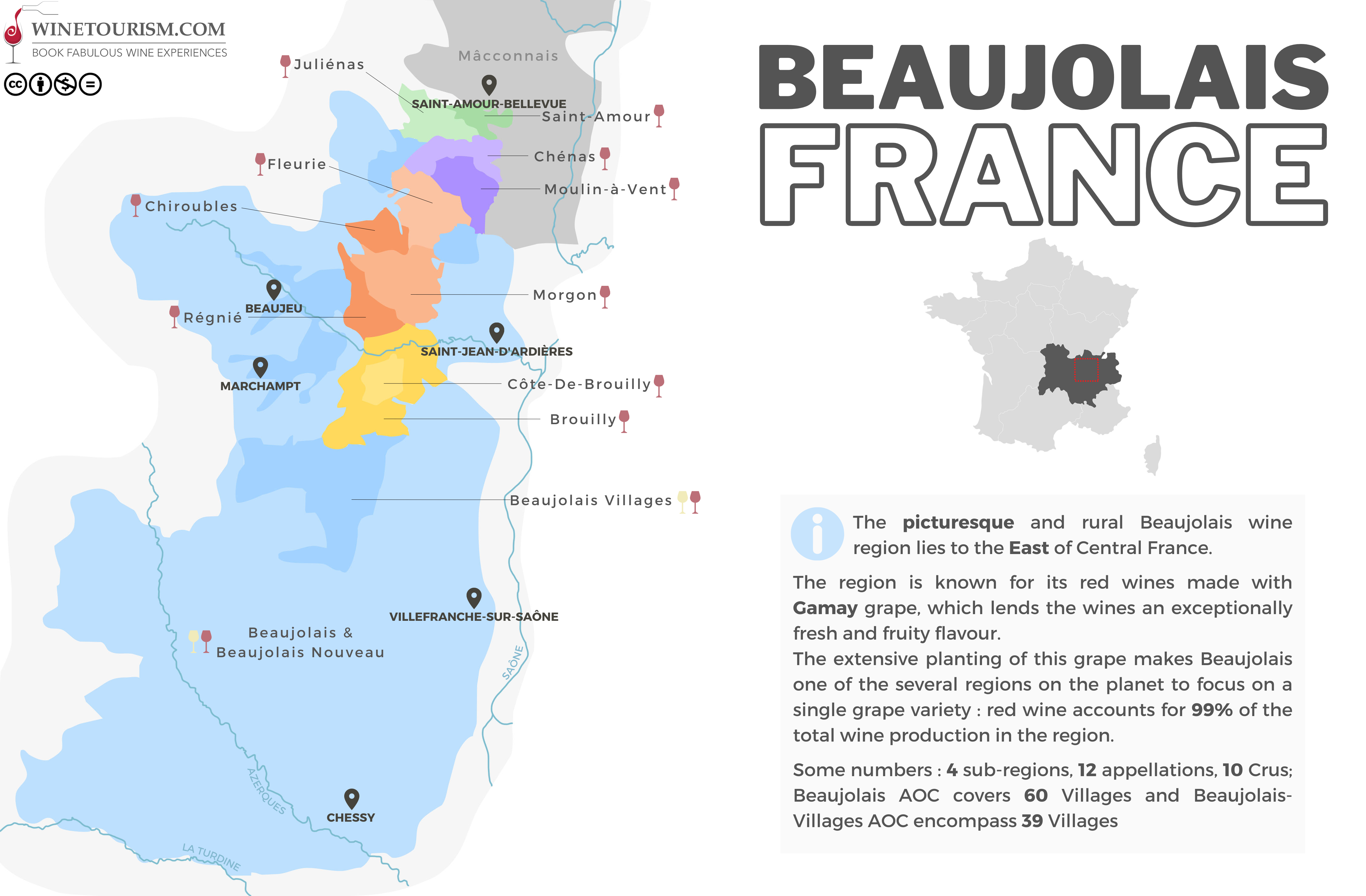 Here you can download a free, detailed, high-resolution wine map over the Beaujolais wine region, France.